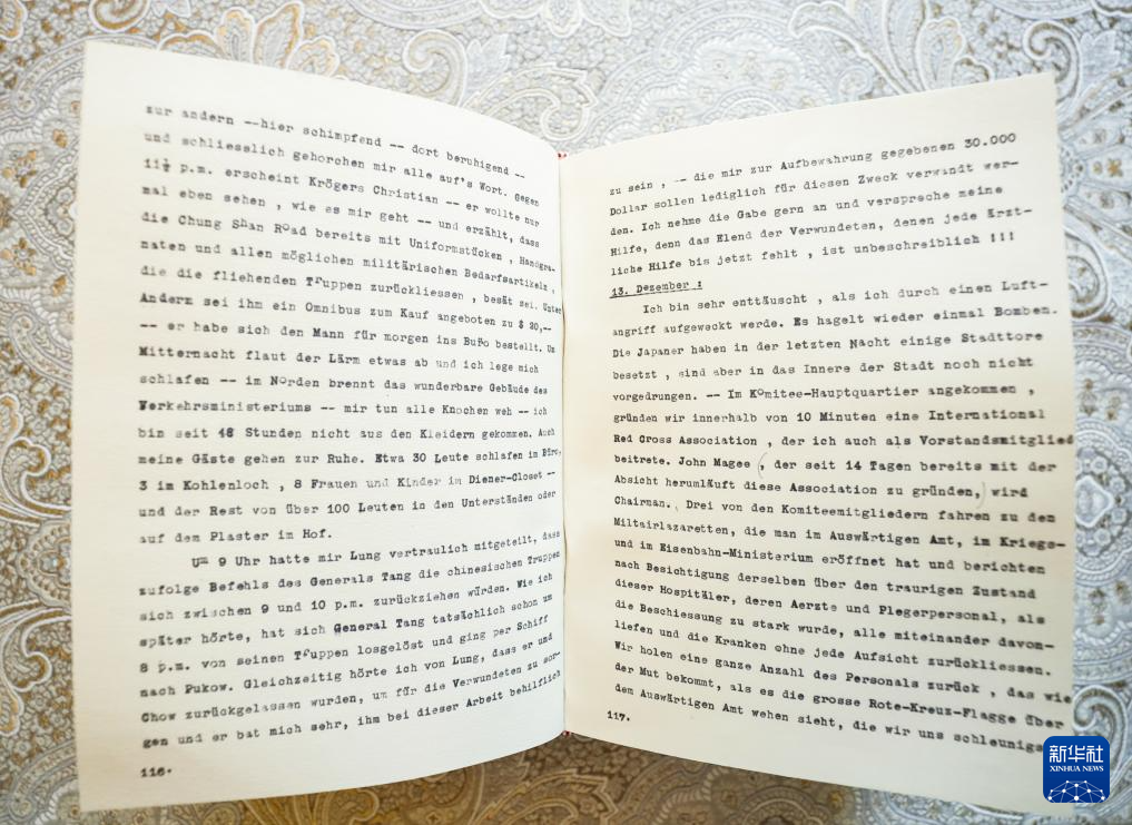 这是8月7日在德国海德堡约翰·拉贝交流中心内拍摄的《拉贝日记》德文原版图书的部分内容。