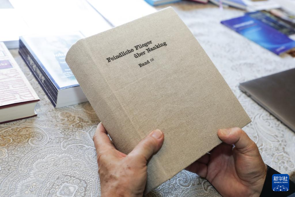 8月7日,托马斯·拉贝在德国海德堡约翰·拉贝交流中心内手持《拉贝日记》德文原版图书。