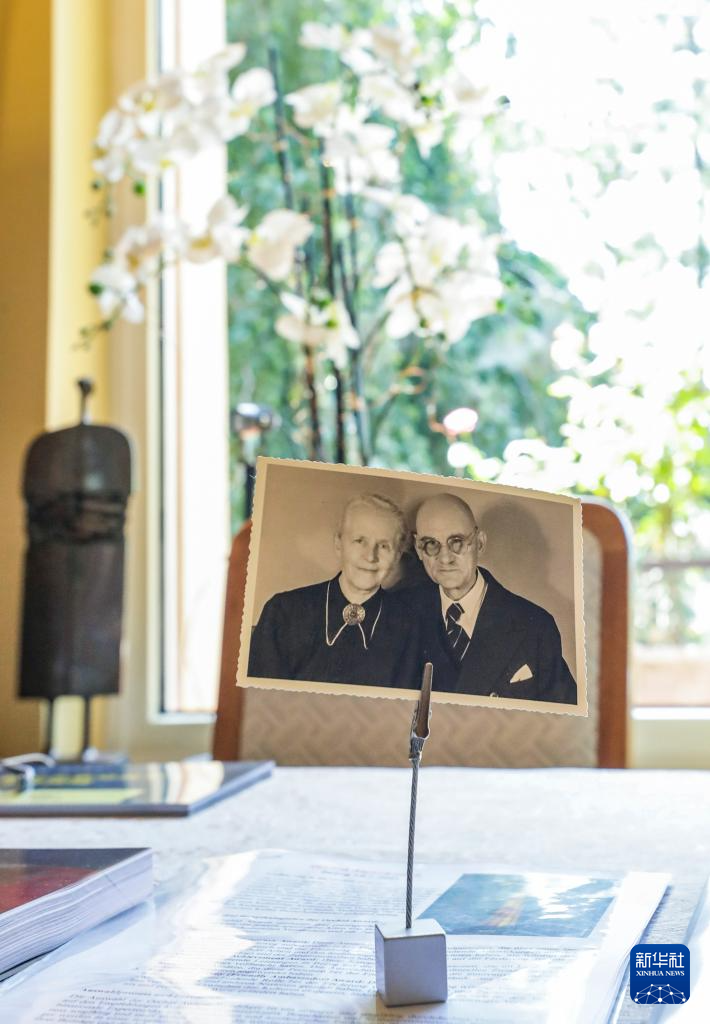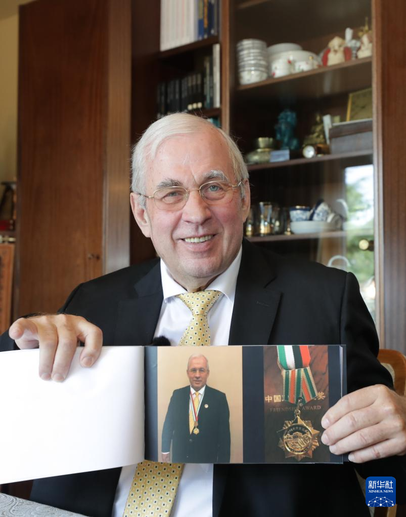 8月7日,托马斯·拉贝在德国海德堡约翰·拉贝交流中心内展示自己佩戴中国政府友谊奖奖章的照片。托马斯·拉贝在2018年荣获中国政府友谊奖,这是中国政府专门为表彰对中国改革发展作出重要贡献的来华工作外国专家设立的荣誉奖项。