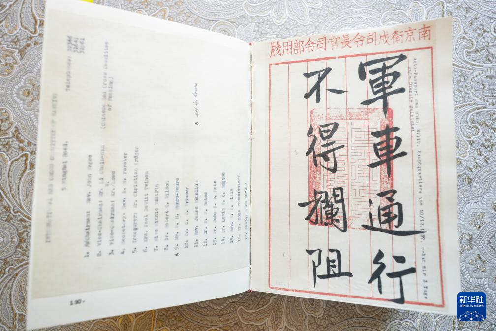 这是8月7日在德国海德堡约翰·拉贝交流中心内拍摄的《拉贝日记》德文原版图书中附录的约翰·拉贝通过努力获得的南京城内车辆通行证。