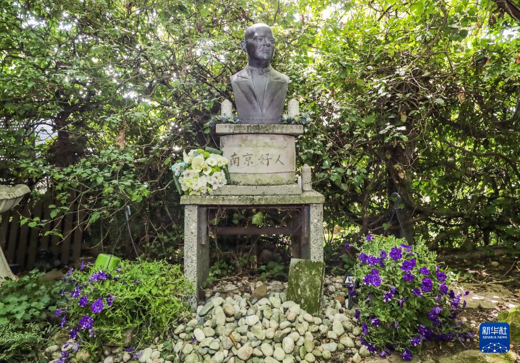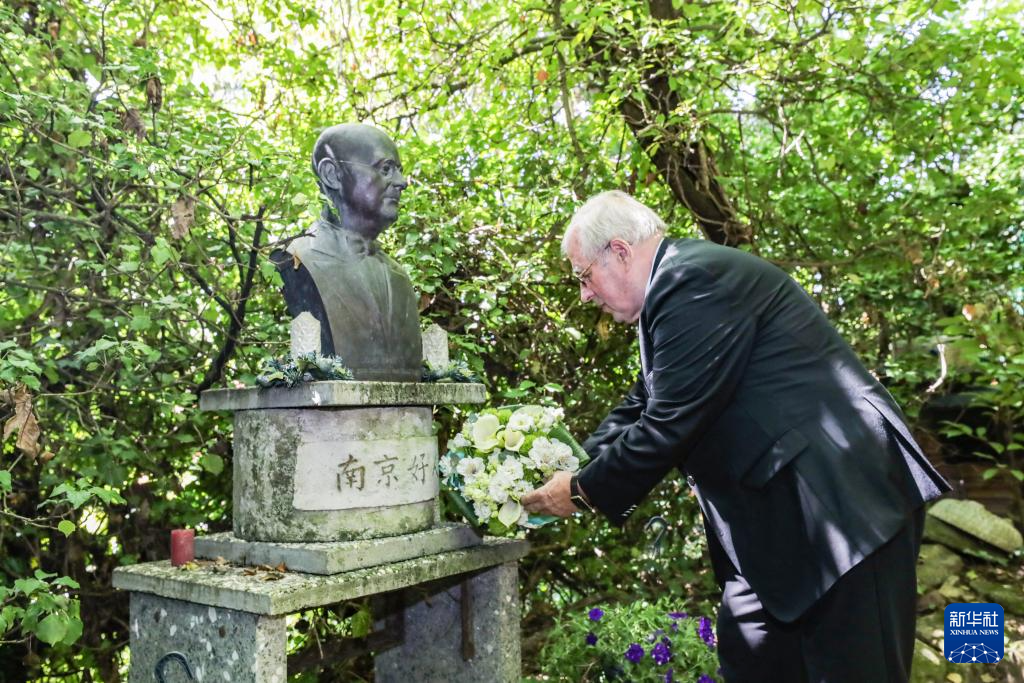 8月7日,在德国海德堡约翰·拉贝交流中心内,托马斯·拉贝在约翰·拉贝雕像前摆放鲜花。
