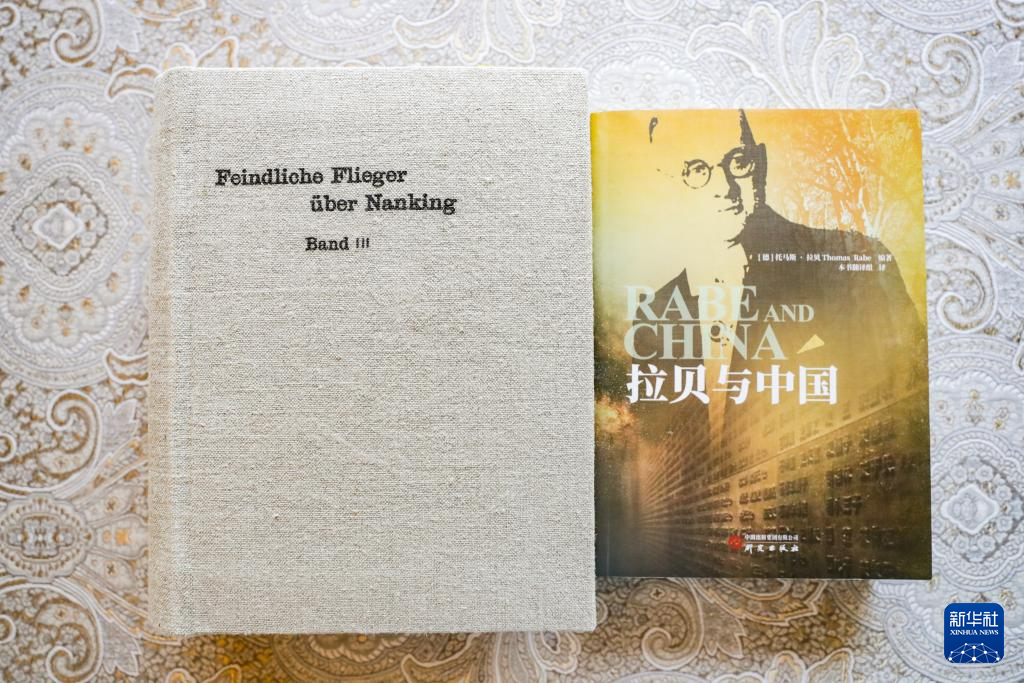 这是8月7日在德国海德堡约翰·拉贝交流中心内拍摄的《拉贝日记》德文原版图书(左)和《拉贝与中国》中文版图书。2024年,托马斯·拉贝整理其祖父的人生经历、南京大屠杀的目击记录、德国专家关于南京大屠杀的观点等内容出版《拉贝与中国》一书,再现了约翰·拉贝在北京、天津、南京30年的生活经历,讲述了拉贝家族几代人同中国人民的情谊。