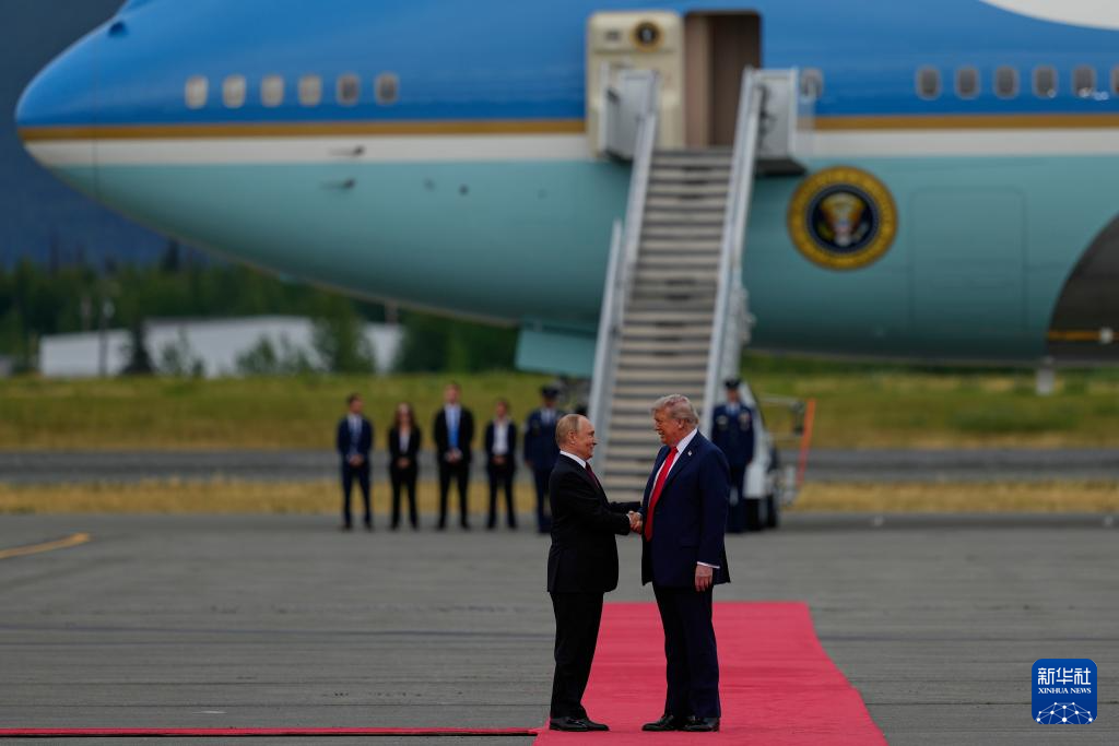 当地时间8月15日11时许,美国总统特朗普(前右)和俄罗斯总统普京在美国阿拉斯加州安克雷奇市埃尔门多夫-理查森联合军事基地的机场会面。新华社/美联