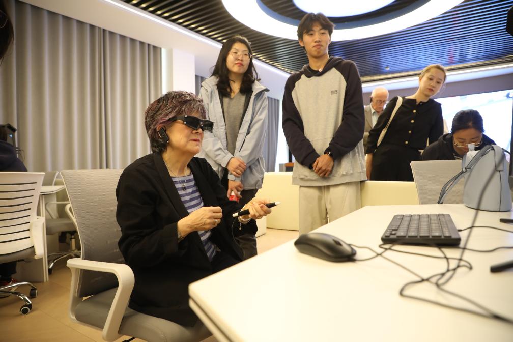 4月15日,在培黎职业学院,英中了解协会荣誉主席佐伊·里德体验学生们亲手设计搭建的虚拟现实场景模型。新华社记者 张智敏 摄