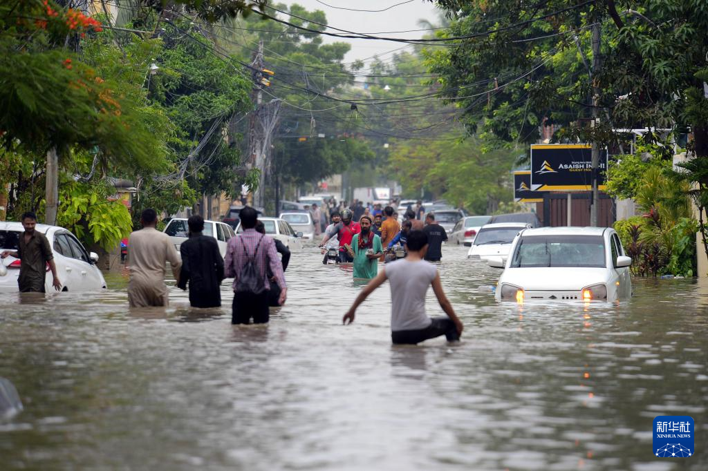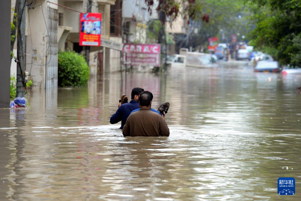 8月19日,在巴基斯坦南部港口城市卡拉奇,当地居民在暴雨过后涉水出行。