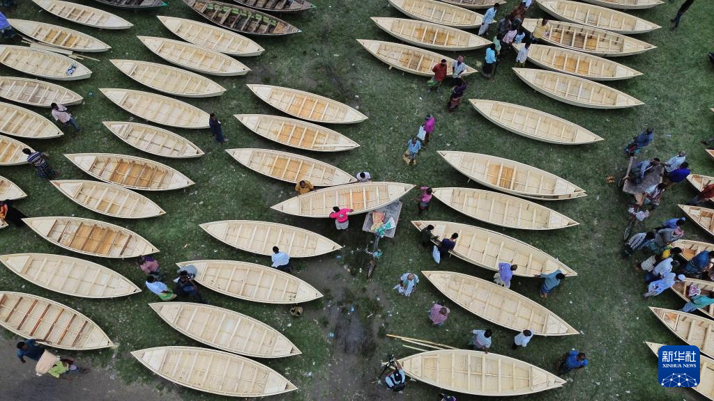 8月20日,人们在孟加拉国马尼格甘杰的传统手工木船市场选购木船(无人机照片)。