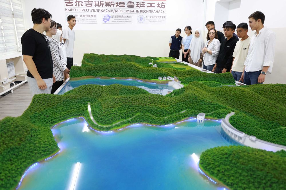 2025年6月4日,在吉尔吉斯斯坦首都比什凯克,师生在吉尔吉斯斯坦鲁班工坊水利枢纽工程模拟演示实验室学习水电站知识。吉尔吉斯斯坦鲁班工坊由浙江水利水电学院与吉尔吉斯斯坦国立技术大学等联合建设,聚焦培养水利水电工程、电气工程及自动化等专业领域人才。