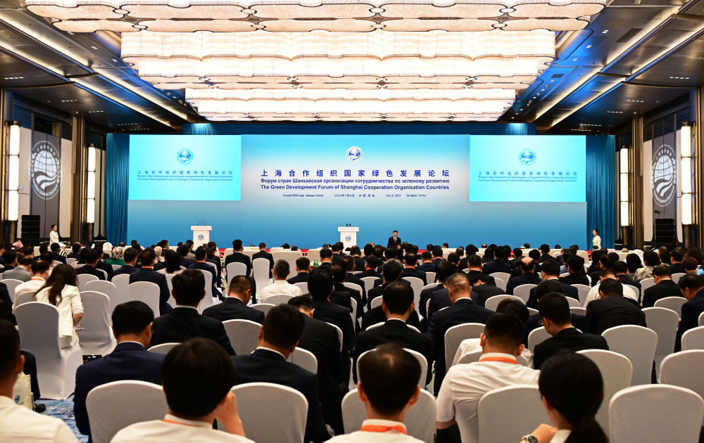 2024年7月8日以“携手绿色发展,推动人与自然和谐共生”为主题的上海合作组织国家绿色发展论坛在山东省青岛市开幕。这是开幕式现场。