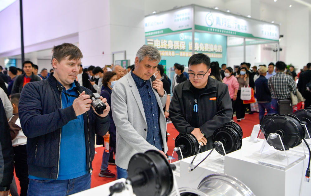 2023年3月30日,第二十一届中国北方国际自行车电动车展览会在天津梅江会展中心开幕,这是来自俄罗斯的两位研发技术人员在展会会场与国内一家电动车部件生产企业洽谈。
