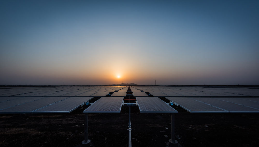 这是2017年4月10日在印度南部城市海德拉巴附近拍摄的一处光伏电站。中国企业为该电站提供了部分太阳能面板组件和全套的自动日照追踪支架系统。