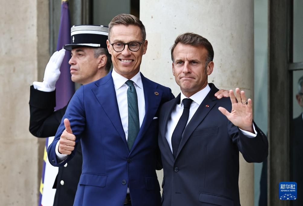 9月4日,在法国首都巴黎的总统府爱丽舍宫,法国总统马克龙(右)迎接出席“志愿联盟”线上会议的芬兰总统斯图布。