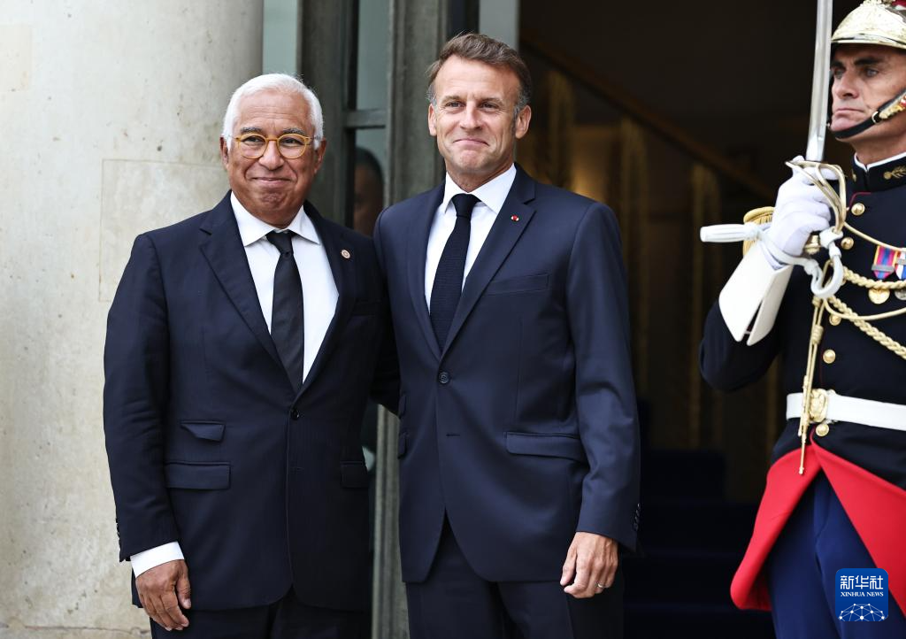 9月4日,在法国首都巴黎的总统府爱丽舍宫,法国总统马克龙迎接出席“志愿联盟”线上会议的欧洲理事会主席科斯塔(左)。
