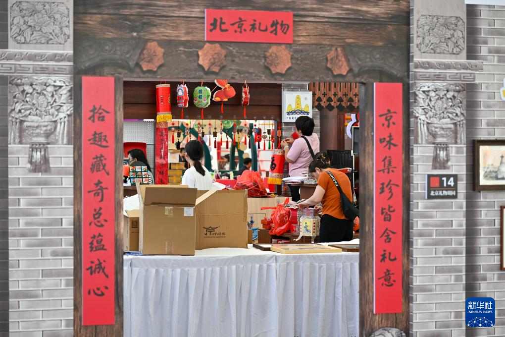 9月9日,服贸会文旅服务专题展的工作人员在布置展区。