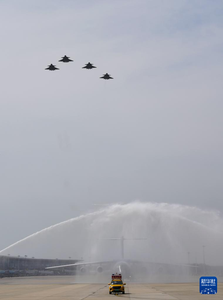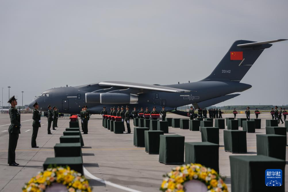 9月12日,第十二批在韩中国人民志愿军烈士遗骸回国。这是在沈阳桃仙国际机场,接运烈士遗骸回国的运-20专机在4架歼-20飞机伴飞护航下即将降落。