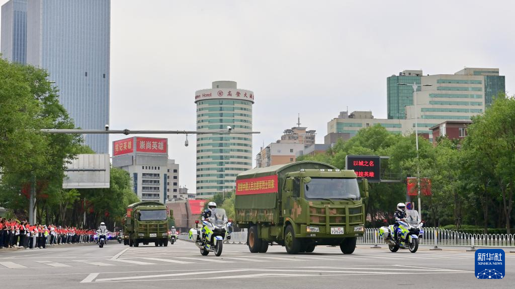 9月12日,第十二批在韩中国人民志愿军烈士遗骸回国。这是运送志愿军烈士遗骸的车队经过沈阳青年大街。