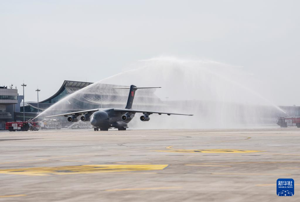 9月12日,第十二批在韩中国人民志愿军烈士遗骸回国。这是在沈阳桃仙国际机场,接运烈士遗骸回国的运-20专机通过水门。