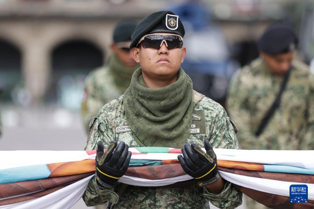 9月16日,在墨西哥首都墨西哥城宪法广场,手持墨西哥国旗的士兵参加独立日阅兵。