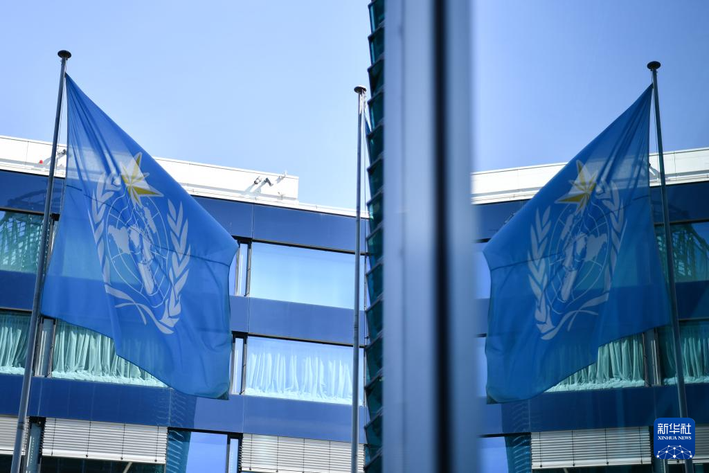 这是9月17日在瑞士日内瓦世界气象组织总部拍摄的世界气象组织旗帜。