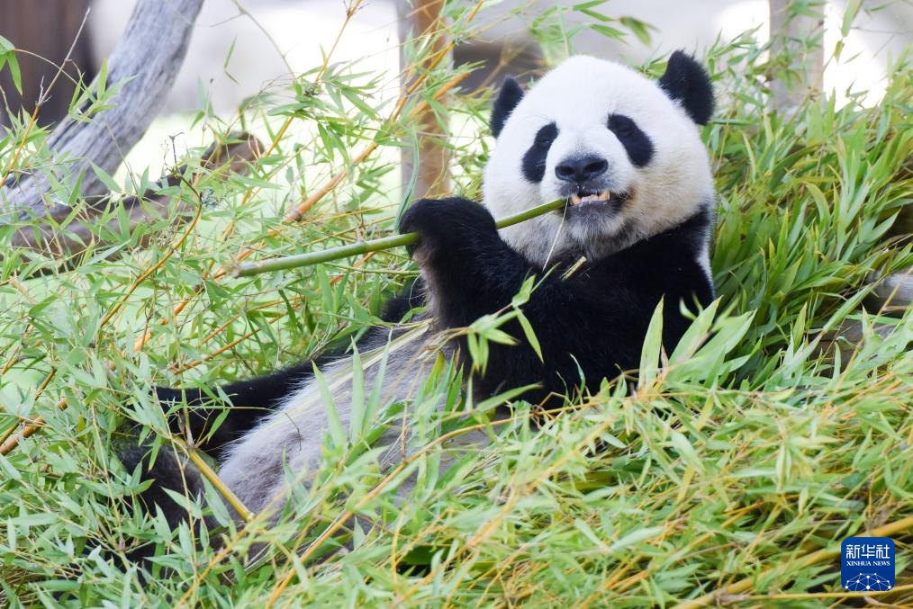9月20日,在西班牙马德里动物园,大熊猫“金喜”在吃竹子。新华社发(古斯塔沃·巴连特摄)