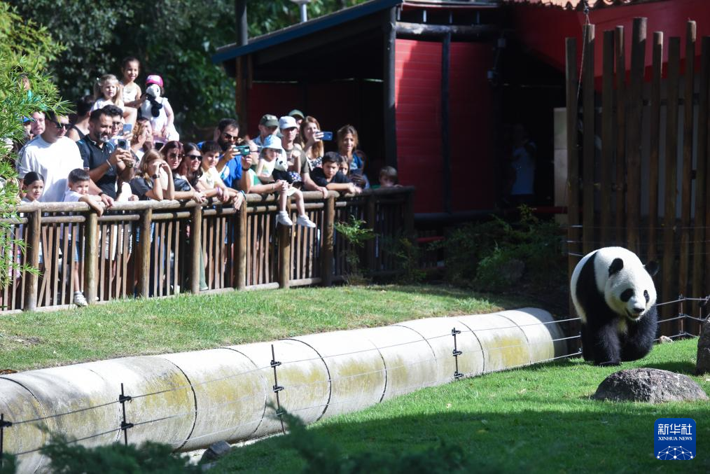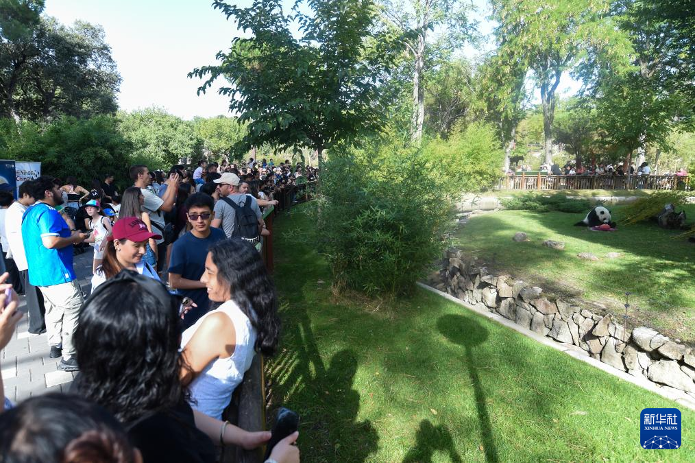 9月20日,在西班牙马德里动物园,游客们与大熊猫“金喜”互动。新华社发(古斯塔沃·巴连特摄)