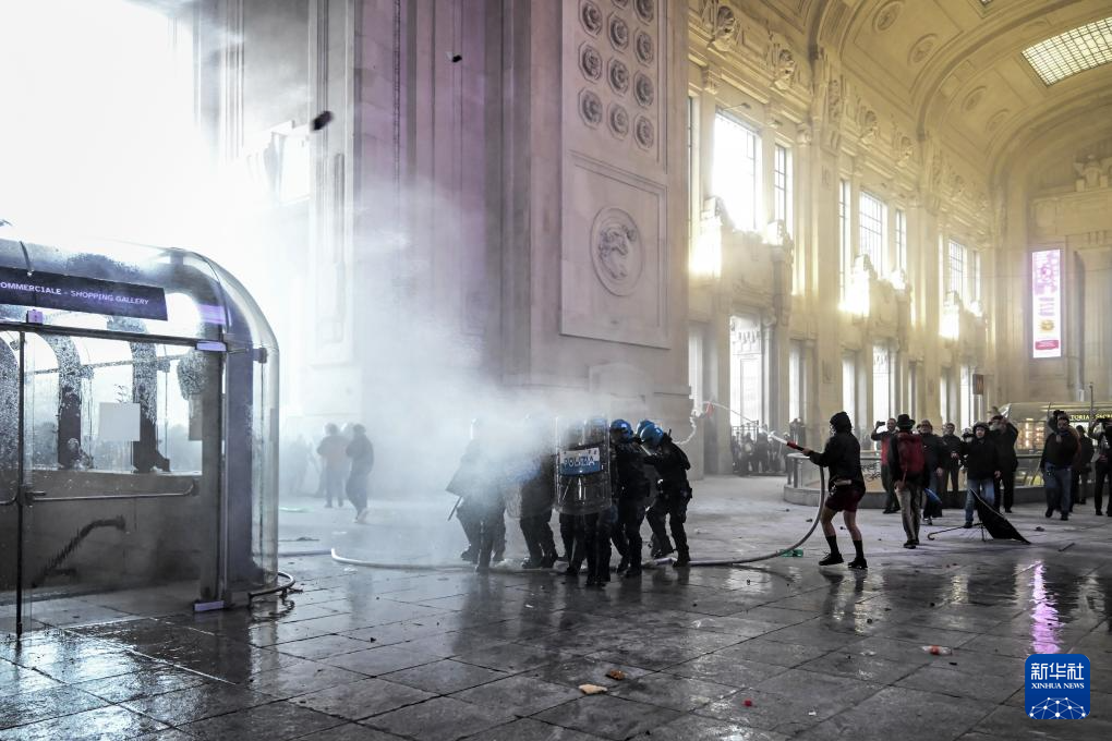 9月22日,在意大利米兰中央火车站,示威者与警察发生冲突。
