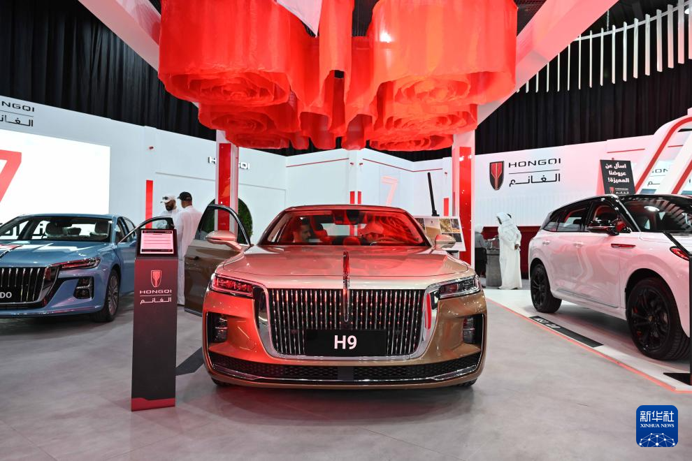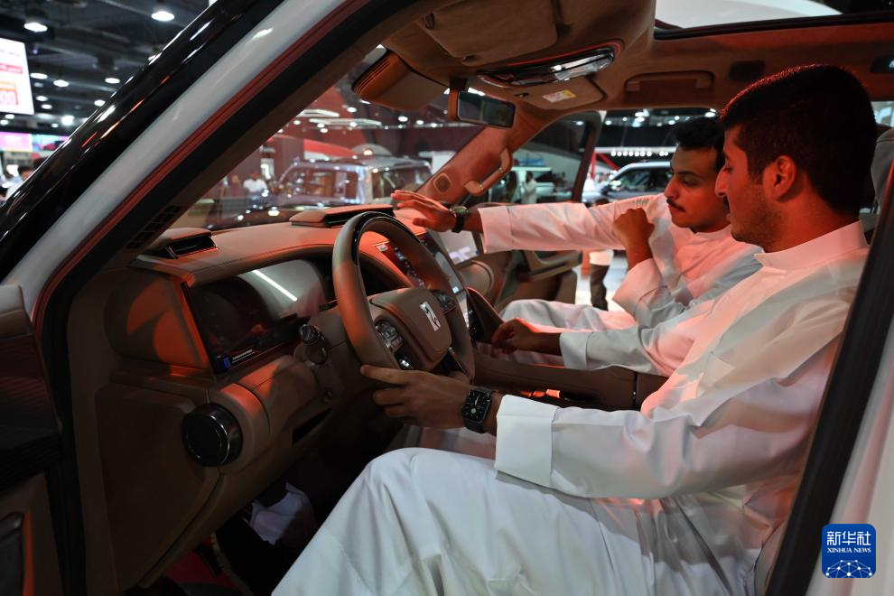 9月22日,在科威特哈瓦利省,人们在车展上体验红旗H9汽车。