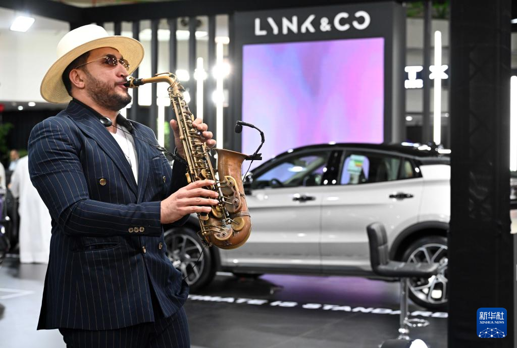 9月22日,在科威特哈瓦利省,一名男子在车展上的领克汽车旁表演。