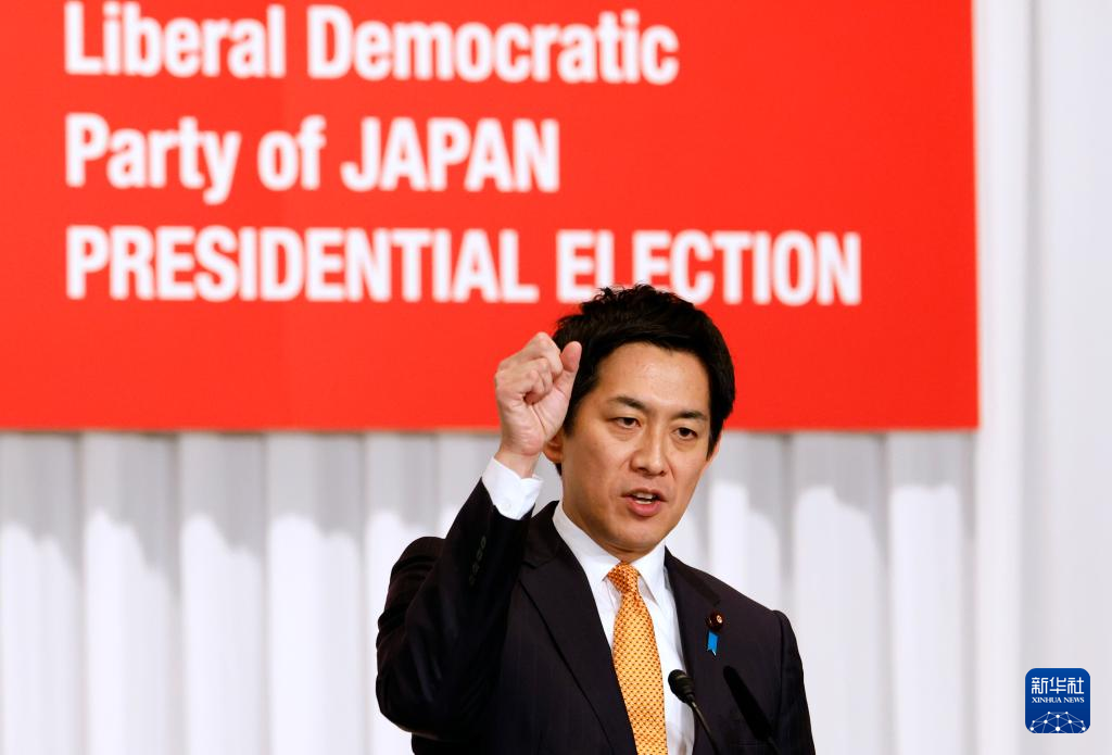 9月22日,在日本东京,日本自民党总裁选举候选人、农林水产大臣小泉进次郎在自民党总裁选举政见发表演讲会上发言。新华社发(Pool图片,弗兰克·罗比雄摄)