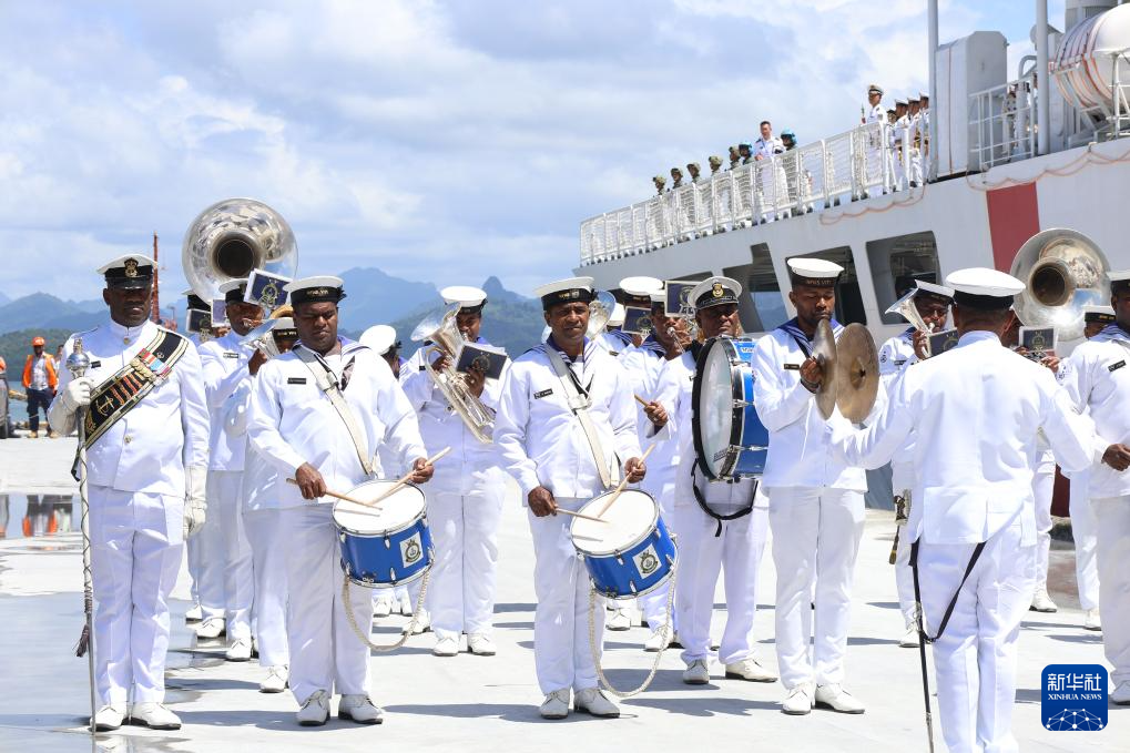 10月1日,中国海军“丝路方舟”号医院船抵达斐济苏瓦,斐方军乐队在欢迎仪式上演奏。新华社发(崔晓洋摄)