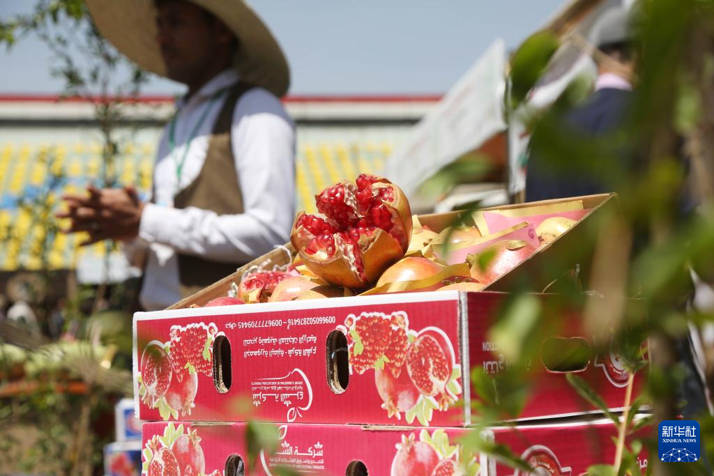 10月6日,在也门首都萨那,一名男子在展会上展示待售的石榴。