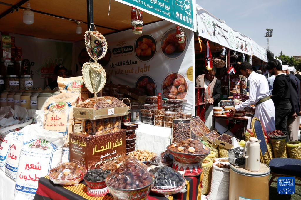 10月6日,在也门首都萨那,人们在展会上购买各种枣类。