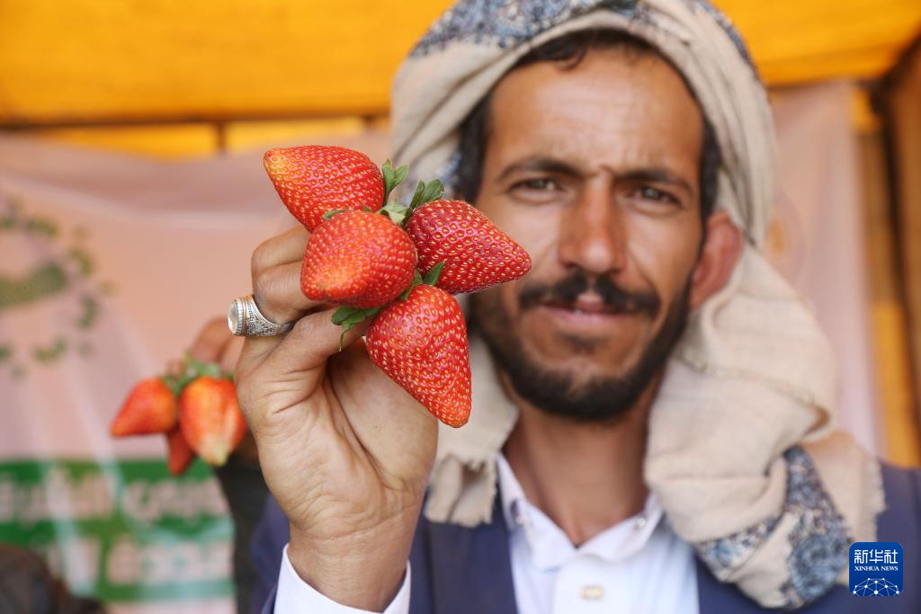10月6日,在也门首都萨那,一名男子在展会上展示待售的草莓。