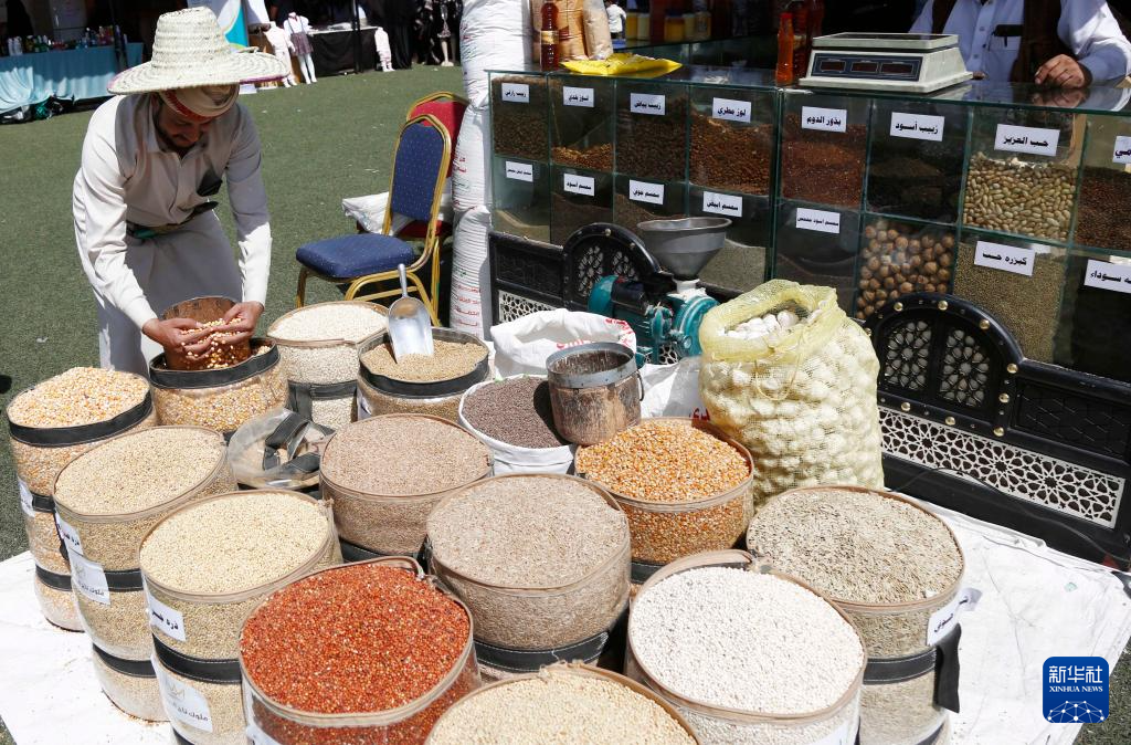 10月6日,在也门首都萨那,一名商贩在展会上展示本地生产的谷物。