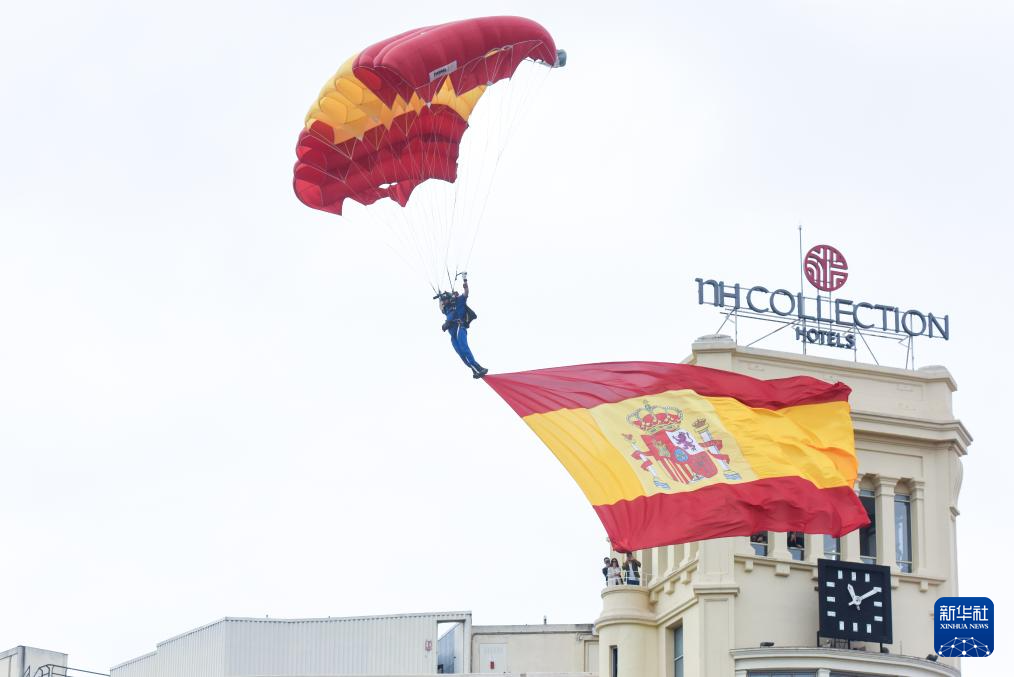 10月12日,在西班牙马德里举行的国庆阅兵式上,一名伞兵携带西班牙国旗从天而降。