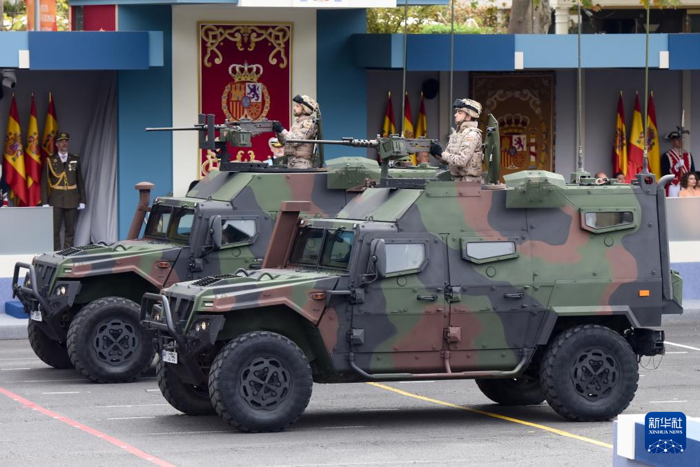 10月12日,在西班牙马德里,西班牙军用车辆编队在国庆阅兵式上接受检阅。