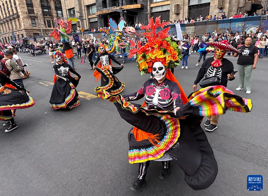 10月18日,在墨西哥首都墨西哥城,人们头戴传统面具载歌载舞参加魔幻动物大游行(手机照片)。