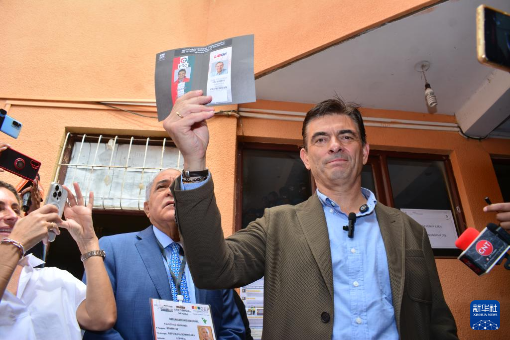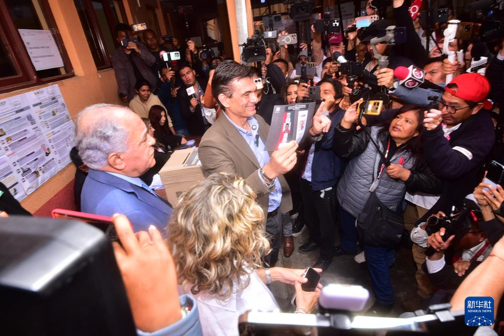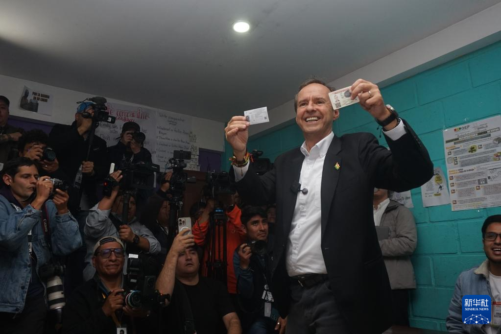 10月19日,在玻利维亚拉巴斯,玻利维亚右翼“自由”联盟候选人、前总统豪尔赫·基罗加在一处投票点展示手中投票证件。