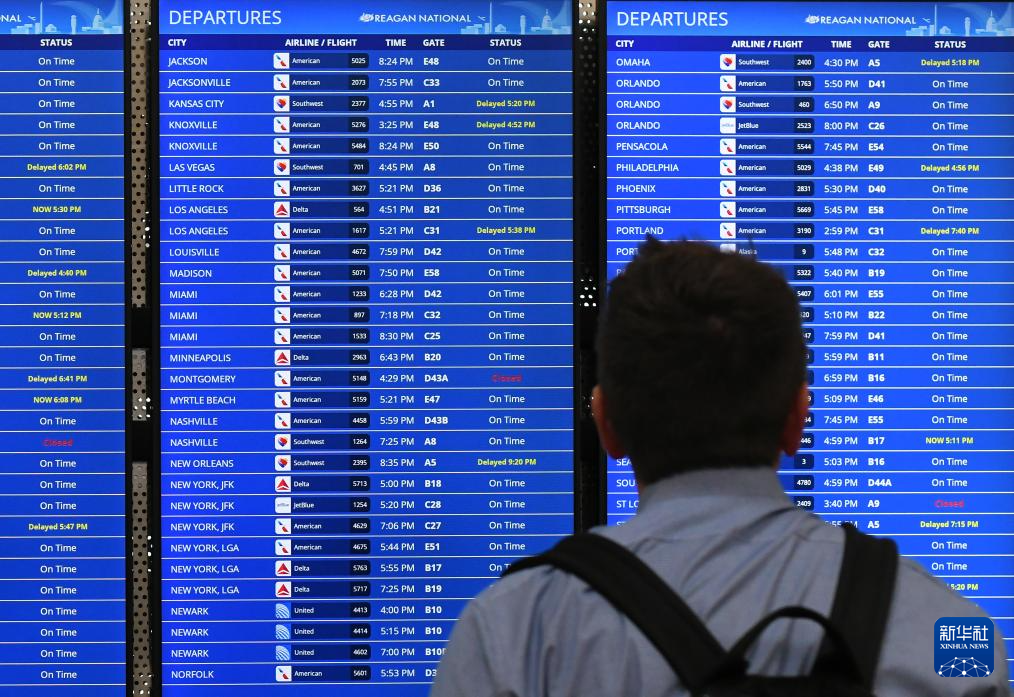 10月10日,在美国弗吉尼亚州阿灵顿的里根国家机场,一名男子查看航班信息。新华社记者 李睿 摄
