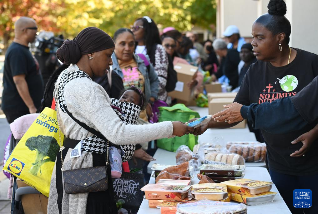 10月21日,在美国马里兰州海厄茨维尔市,联邦雇员领取免费食品。新华社记者 李睿 摄