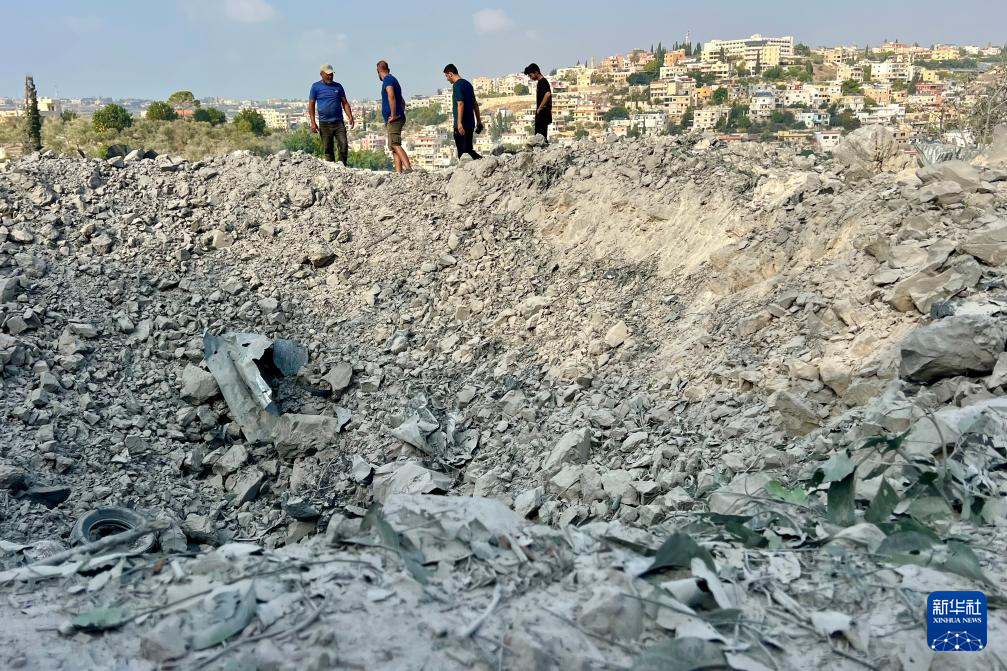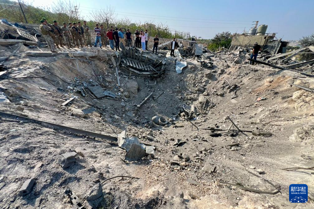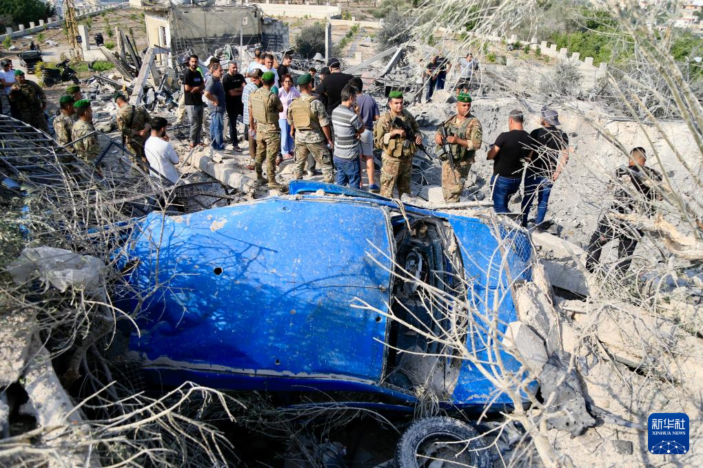 11月6日,在黎巴嫩南部城市提尔的阿巴西耶镇,黎巴嫩民众和军人查看以色列空袭现场。
