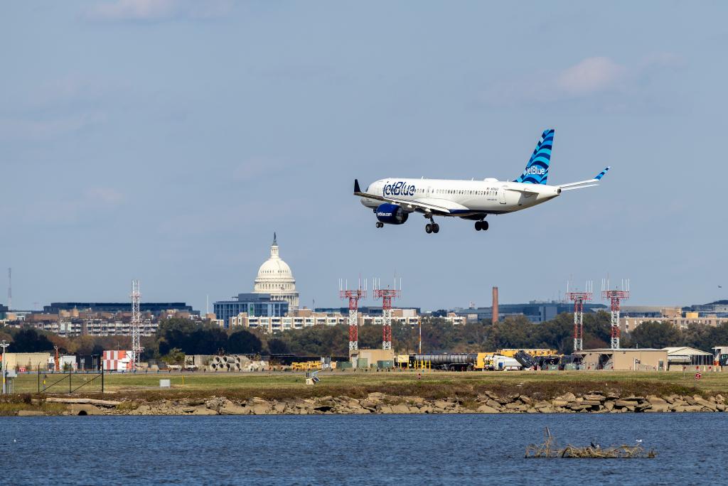 11月1日,一架飞机降落在美国弗吉尼亚州阿灵顿的里根国家机场。新华社记者胡友松摄