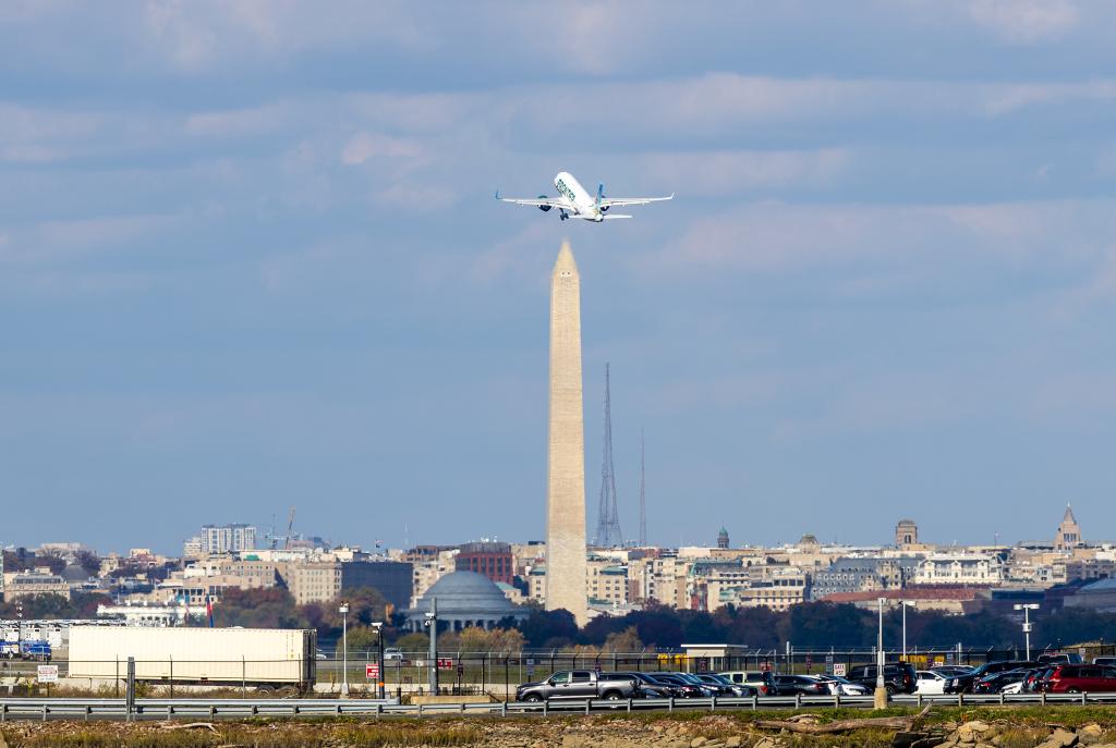 11月1日,一架飞机从美国弗吉尼亚州阿灵顿的里根国家机场起飞。新华社记者胡友松摄