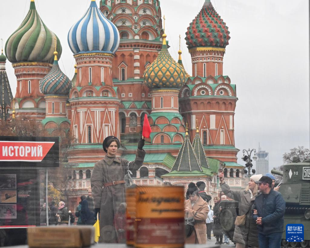 11月7日,在俄罗斯首都莫斯科,人们参观以纪念1941年苏联红场阅兵式为主题的露天展览。