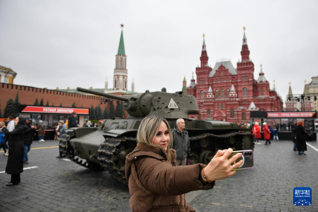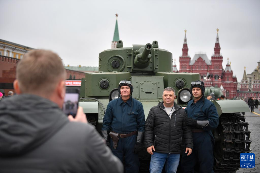 11月7日,在俄罗斯首都莫斯科,人们在以纪念1941年苏联红场阅兵式为主题的露天展览上拍照。