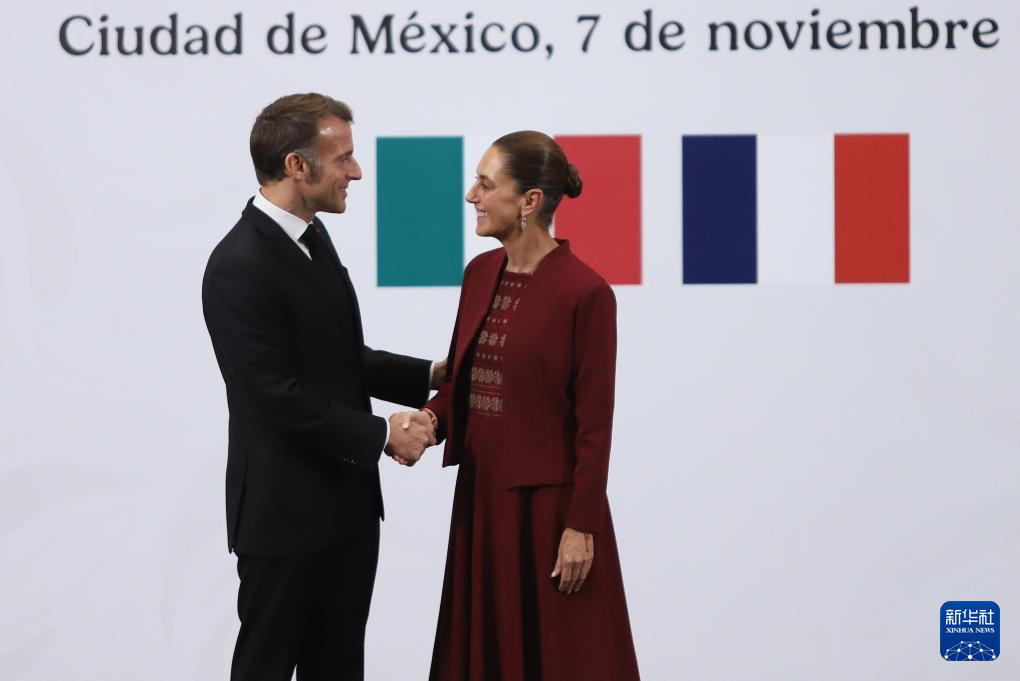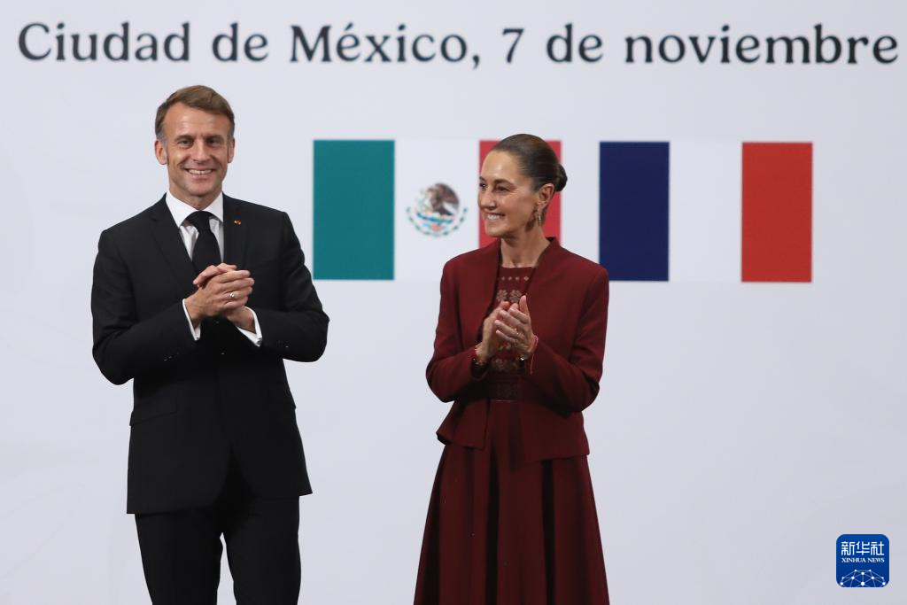 11月7日,墨西哥总统辛鲍姆(右)与到访的法国总统马克龙在首都墨西哥城国家宫共同出席新闻发布会。