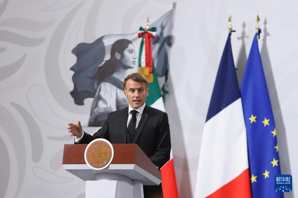 11月7日,到访的法国总统马克龙在墨西哥首都墨西哥城国家宫出席与墨西哥总统辛鲍姆(未在画面中)的新闻发布会。