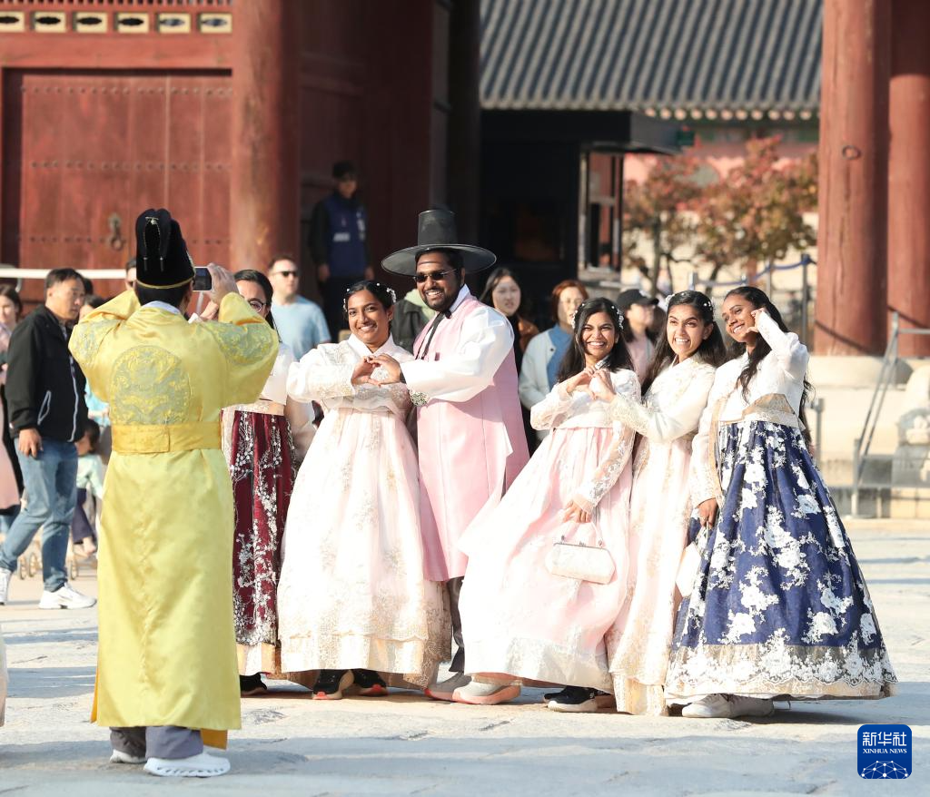 11月7日,游客身着韩服在韩国首尔景福宫合影。