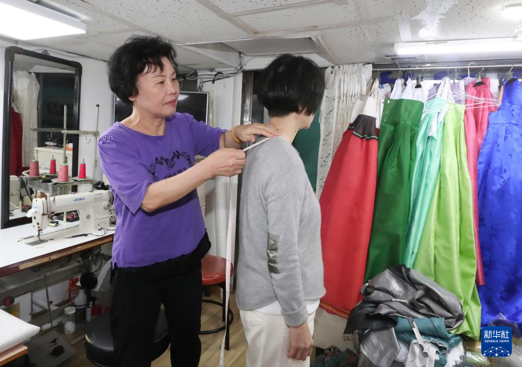 10月14日,在韩国首尔广藏市场的一家韩服裁缝店,裁缝为客人测量尺寸。