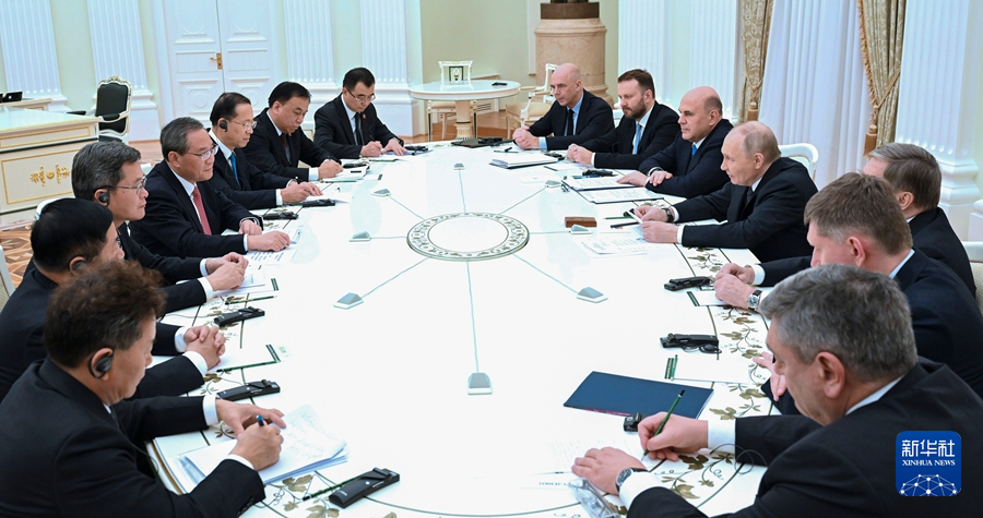 李强首先转达习近平主席对普京总统的亲切问候和良好祝愿。李强表示,在两国元首战略引领下,中俄新时代全面战略协作伙伴关系保持高水平运行。今年以来,习近平主席同普京总统两度会晤,为中俄关系进一步发展指明了方向。面对变乱交织的国际形势,中方愿同俄方秉持世代友好初心,加强发展战略对接,深化各领域合作,取得更多实际成果,更好服务两国发展振兴。