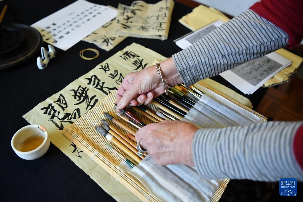 11月19日,在瑞士日内瓦,“乐鱼亭”书法工作室的学员整理毛笔。新华社记者 连漪 摄